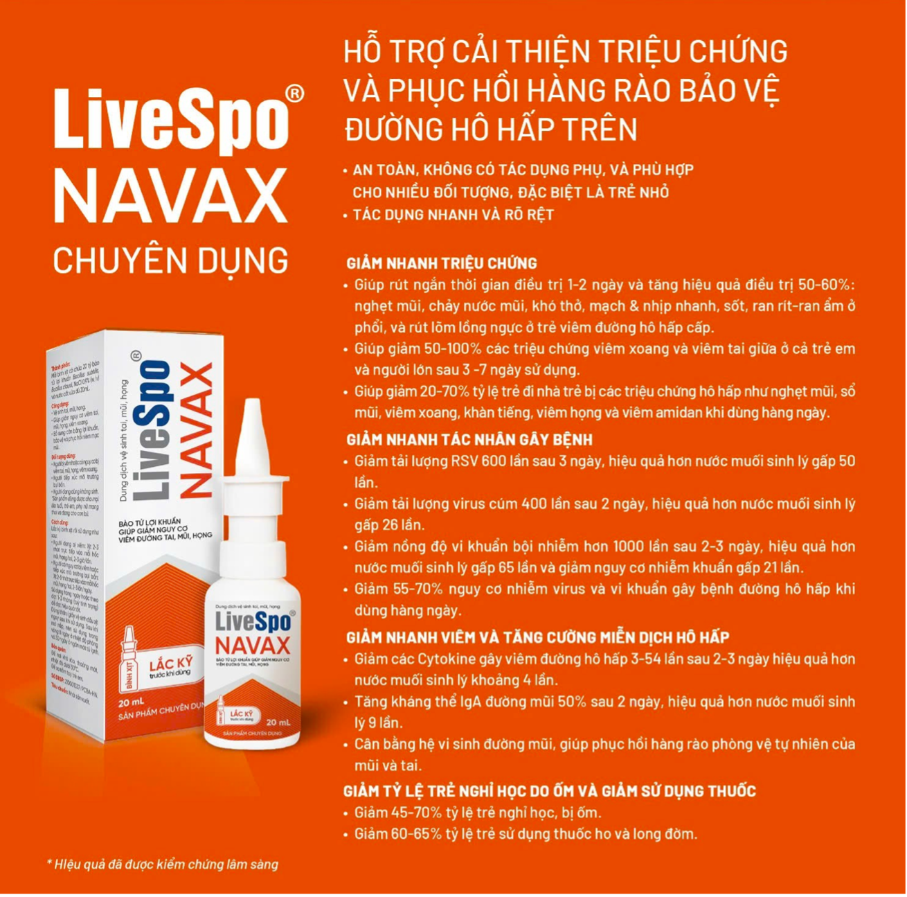 - Tính năng, tác dụng: + LIVESPO® NAVAX chuyên dụng: Hỗ trợ cải thiện triệu chứng và phục hồi hàng rào bảo vệ đường hô hấp trên